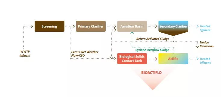 Si tratta di un trattamento biologico - in una vasca di pre-contatto l'acqua inquinata (BOD) viene trattata con fanghi attivi - seguito da una chiarificazione secondaria ad alte prestazioni: Actiflo®.
